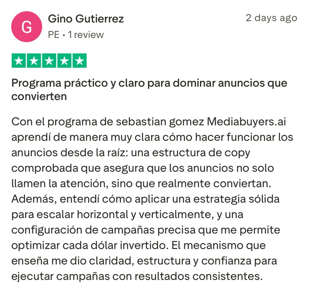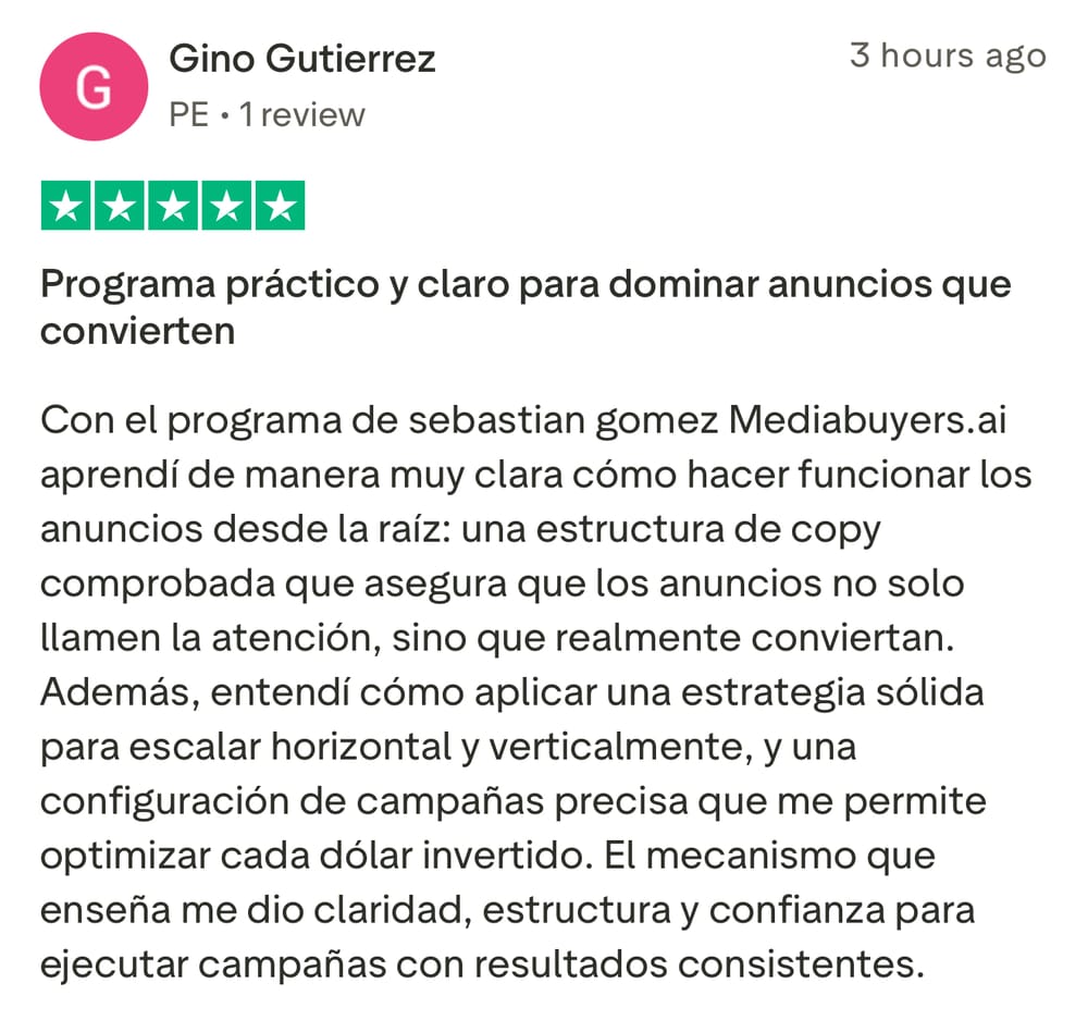 Sebastian Gomez y MediaBuyers.ai no pueden y no hacen ninguna garantía sobre su capacidad para obtener resultados o ganar dinero con nuestras ideas, información, herramientas o estrategias. Nada en esta página, ninguno de nuestros sitios web, ni ninguno de nuestros contenidos o currículo es una promesa o garantía de resultados o ganancias futuras, y no ofrecemos ningún asesoramiento legal, médico, fiscal u otro asesoramiento profesional. Todos los números financieros a los que se hace referencia aquí o en cualquiera de nuestros sitios son solo ilustrativos de conceptos y no deben considerarse ganancias promedio, ganancias exactas o promesas de rendimiento real o futuro. Tenga precaución y siempre consulte a su contador, abogado o asesor profesional antes de actuar sobre esta o cualquier información relacionada con un cambio de estilo de vida o su negocio o finanzas. Usted es el único responsable de sus decisiones, acciones y resultados en su vida, y al registrarse aquí acepta no intentar responsabilizarnos por sus decisiones, acciones o resultados, en ningún momento y bajo ninguna circunstancia.