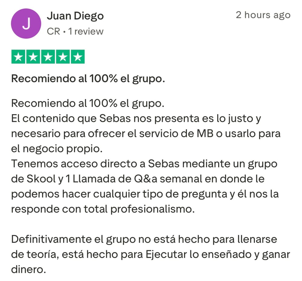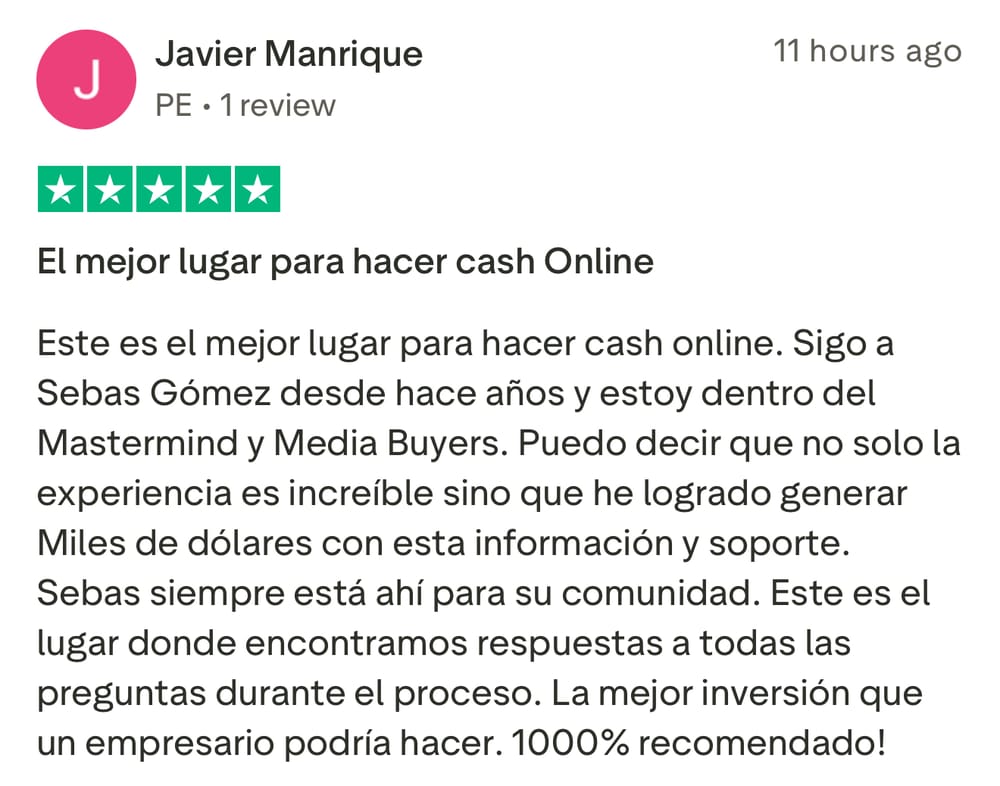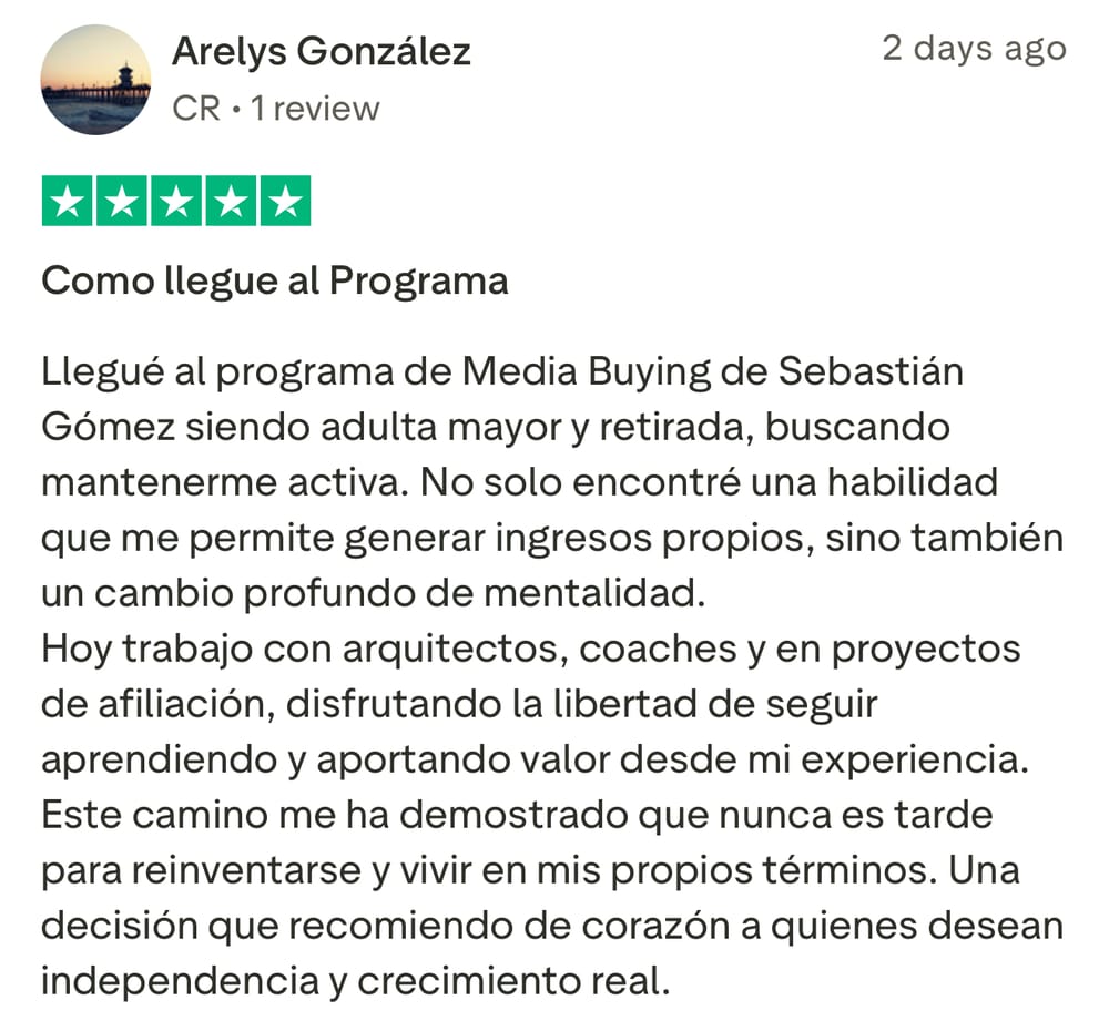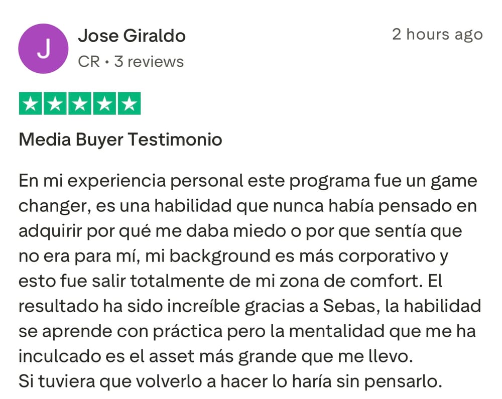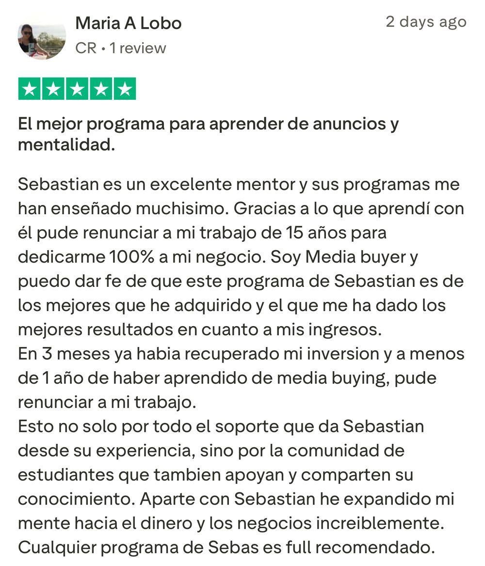 Si le interesa unirse al grupo de Media Buyers, y trabajar directamente con Sebastián para iniciar su transformación, y ayudarlo a generar $3,000/mes recurrentes en los próximos 90 días como Media Buyer, llene el formulario para aplicar (sólo para gente seria que no hace excusas y esta lista para hacer el trabajo necesario).